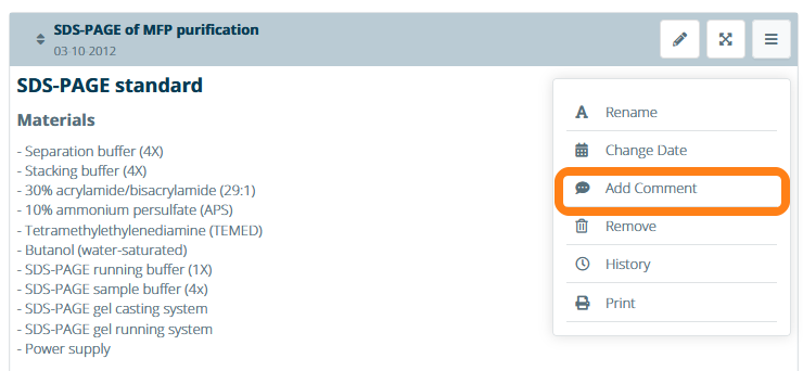 Comments can also be made on signed experiments. Click the Add Comment button to create a comment. You can view a section's comment history by opening its context menu and clicking Show Comments History.