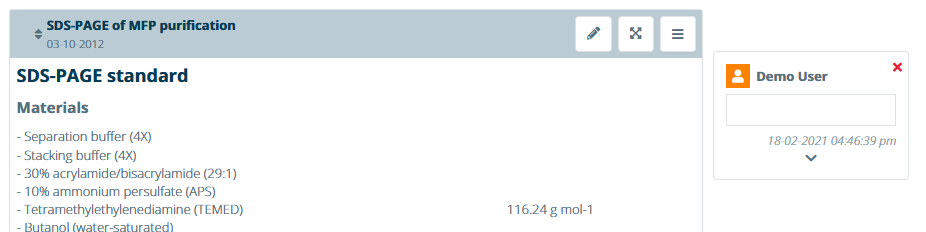 A comment will be placed next to the experiment section. Comments serve to inform other lab members about the content of an experiment section while the experiment is in progress. As remarks are not part of the experiment data, they should be removed prior to signing the experiment. Any data in a comment that needs to be recorded should be added to an experiment section.