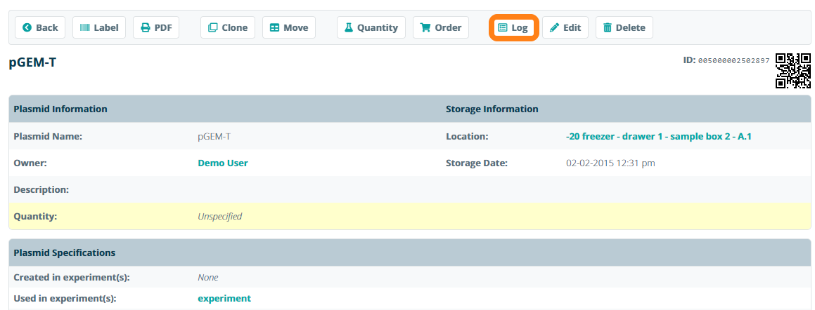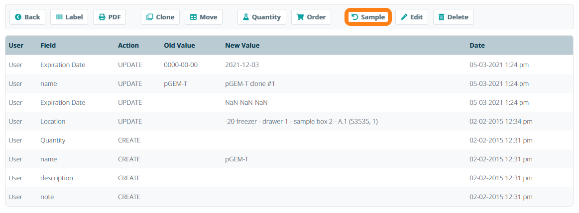 All changes in sample information are recorded in a chronological sample log. To view the sample log, open the sample information sheet and click Log.